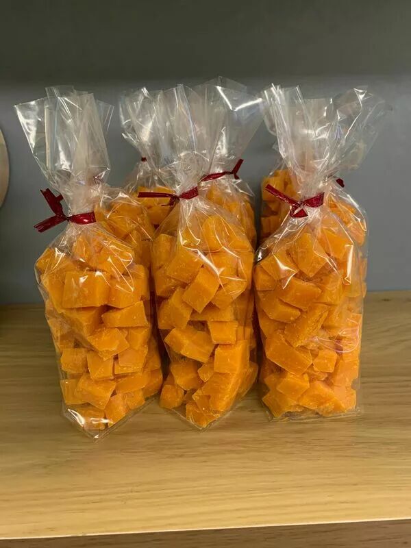 Sa croûte, parsemée de stries, est fine et est recouverte d'un duvet blanc parfois orné de tâches rouges à brunes.